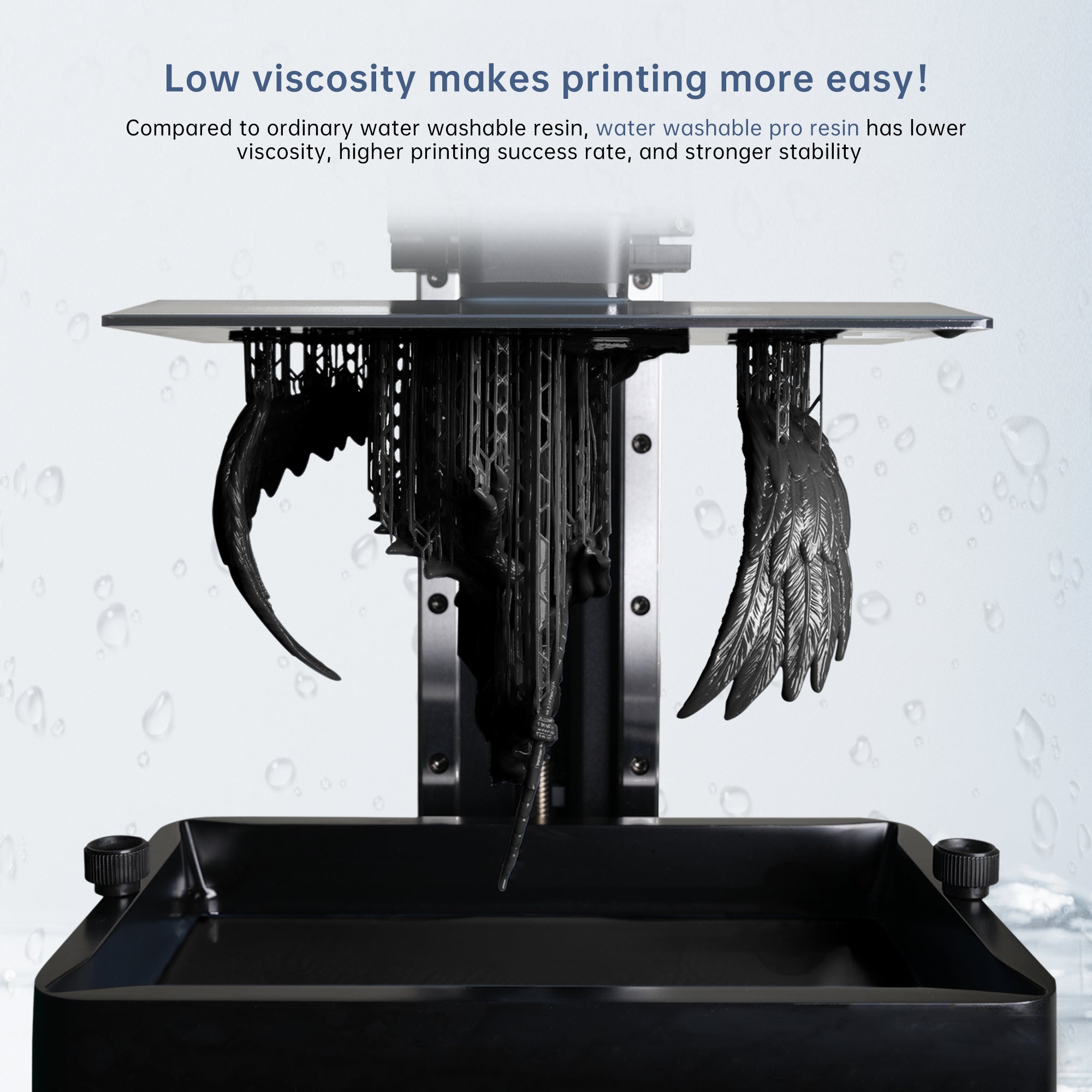 - Low Viscosity:low Viscosity is one main character of excellent resin,it will help you to print less failure, JAMG HE 10K Water Washable Resin is low Viscosity resin and will assit you to print more sucessfully with less worried.
